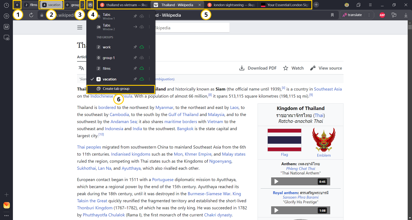 With tab groups, you can easily organize your browser. You can create new groups, classify tabs, and move them between groups and windows to make working as convenient as possible.