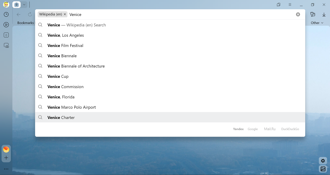 You can use the SmartBox to search on websites that support OpenSearch (such as wikipedia.org). To do this: