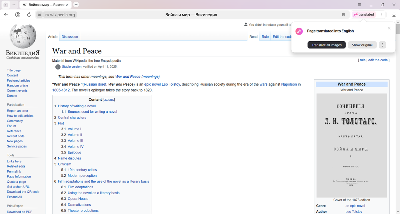 Yandex Browser automatically detects the language of the loaded page. If it's different from the interface language, Yandex Browser asks if you want to translate it. You can also open the translation window by clicking or → Translate page.
