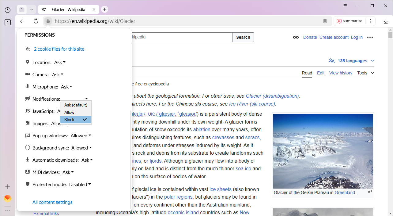 To provide safe and convenient browsing experience, Yandex Browser applies various processing rules to site elements. It blocks pop-ups, warns you when a website requests your location, and so on. To change Yandex Browser behavior for all sites or the selected one, go to settings or use the Protect panel. For example, you can choose to block JavaScript on all sites or allow a site to access your camera.
