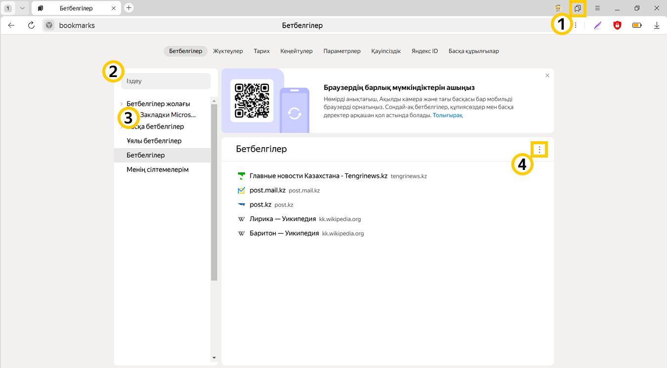 Барлық бетбелгілеріңізді көру үшін бетбелгілер менеджеріне өтіңіз:  белгішесін басыңыз. Бетбелгілер опциясының оң жағында  → Бетбелгілер менеджерін ашу түймесін басыңыз.