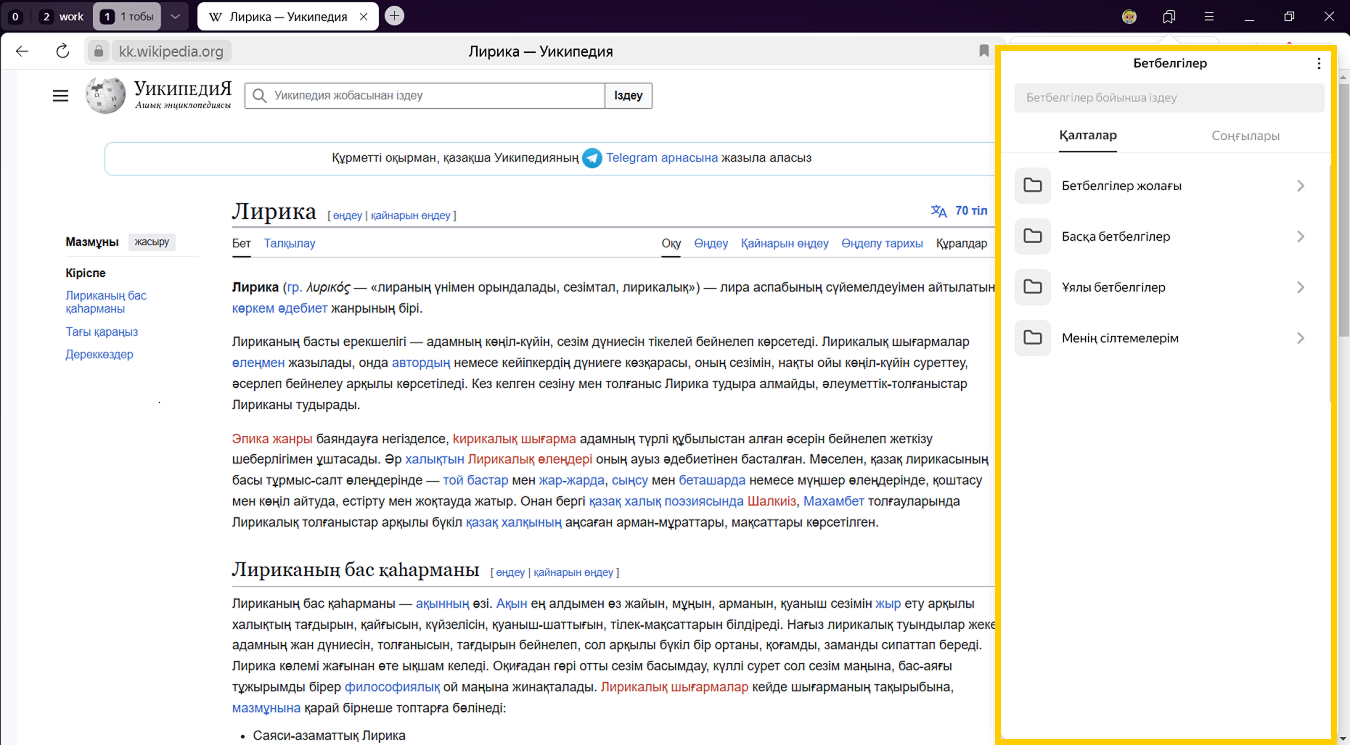 • Соңғы қойындысында — егер сіз жақында бетбелгі қосқан болсаңыз.