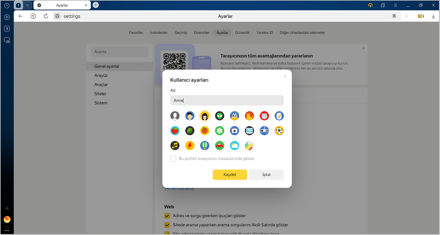 Kullanıcı profili, Yandex Browser'a ilişkin kişisel ayarlar ve veriler setidir. Bu profil Yandex Browser'ın kurulumu sırasında otomatik olarak oluşturulur ve şunları içerir: