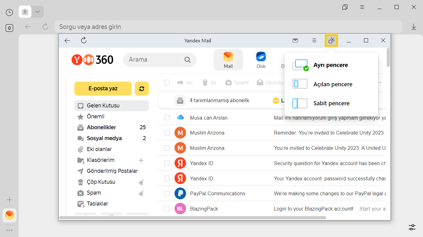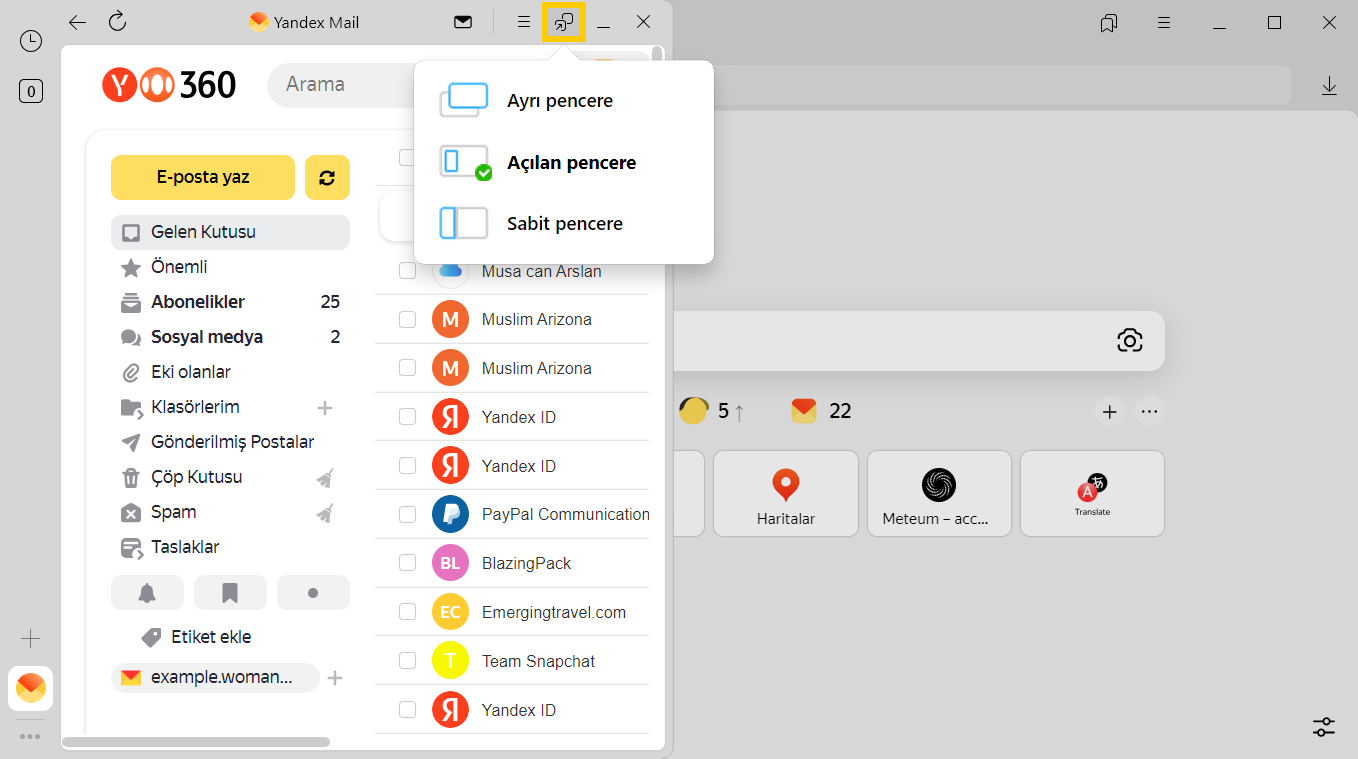 Favori servislerinizi web uygulamaları gibi kullanabilmek için onları yan panele ekleyin; böylece bunları tek tıkla açabilir ve sürekli istenilen sekmeyi aramaktansa ayrı bir pencerede bu servislere kolayca erişirsiniz. Örneğin, Yandex Browser’ın birçok sekme içeren ana penceresini açmadan Yandex Mail’deki e-postaları kontrol edebilir.