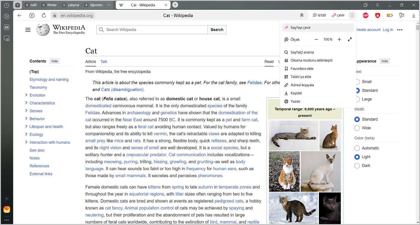 Bu modda aktif sekmedeki metni, görseli, web sayfasını ya da videoyu çevirebilirsiniz.