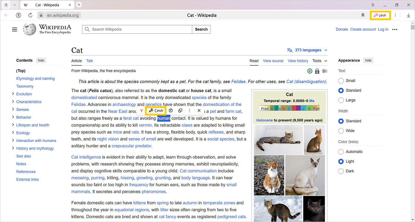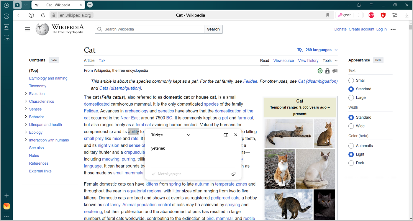 Yandex Browser bir sayfada bulunan sözcük ve cümleleri hedef dile çevirebilmektedir. Bir kelime veya kelime öbeğinin çevirisini görmek için onları seçin ve bağlam menüsünde Çevir seçeneğine tıklayın. Sayfada çeviri penceresi belirecektir.