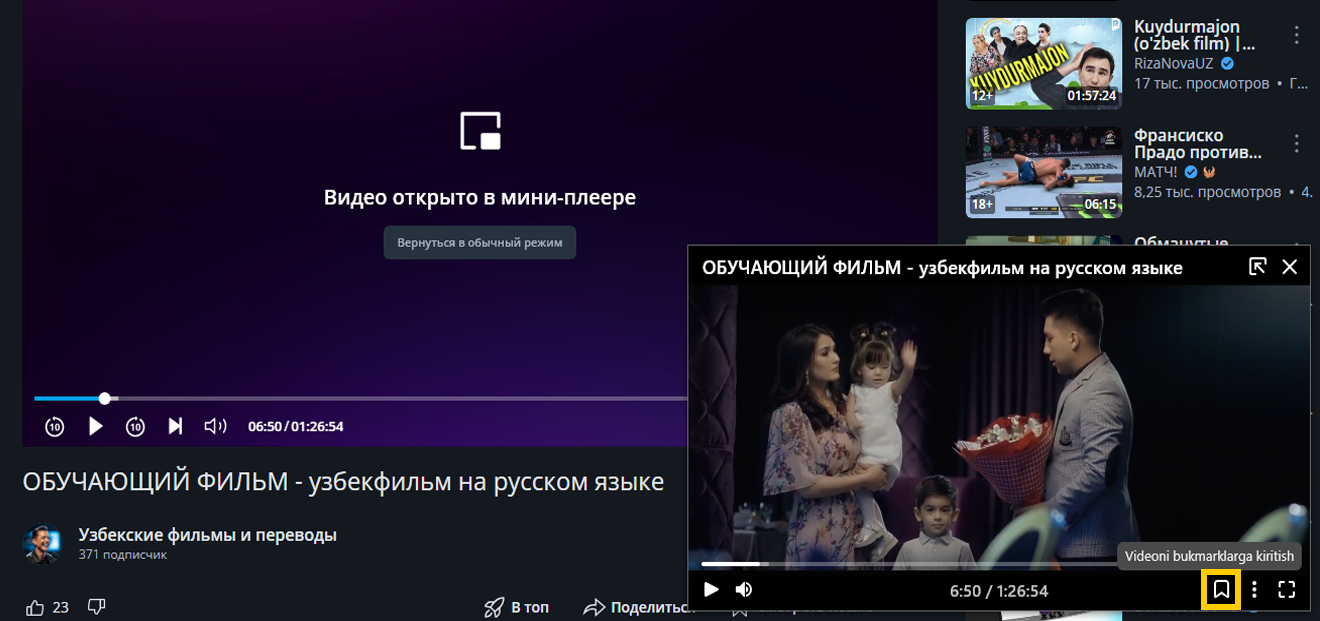 Video pleyerning yuqori qismiga sichqoncha kursorini olib keling va Открыть видео в отдельном окне bosing. Videoli alohida oyna ochiladi.