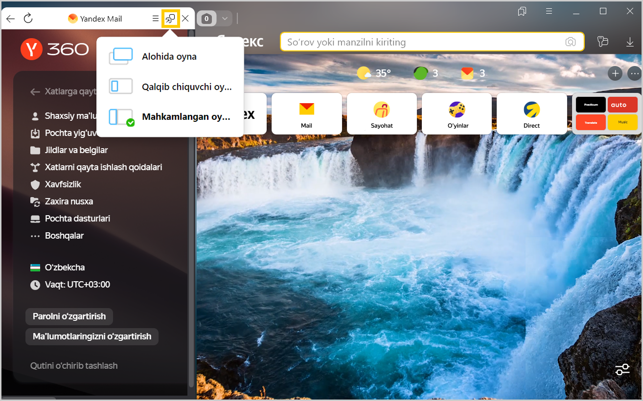 Bu rejimda siz asosiy oyna bilan ishlayotganda yana bitta xizmatni koʻrishingiz mumkin (chatlar, pochta, onlayn translatsiya).