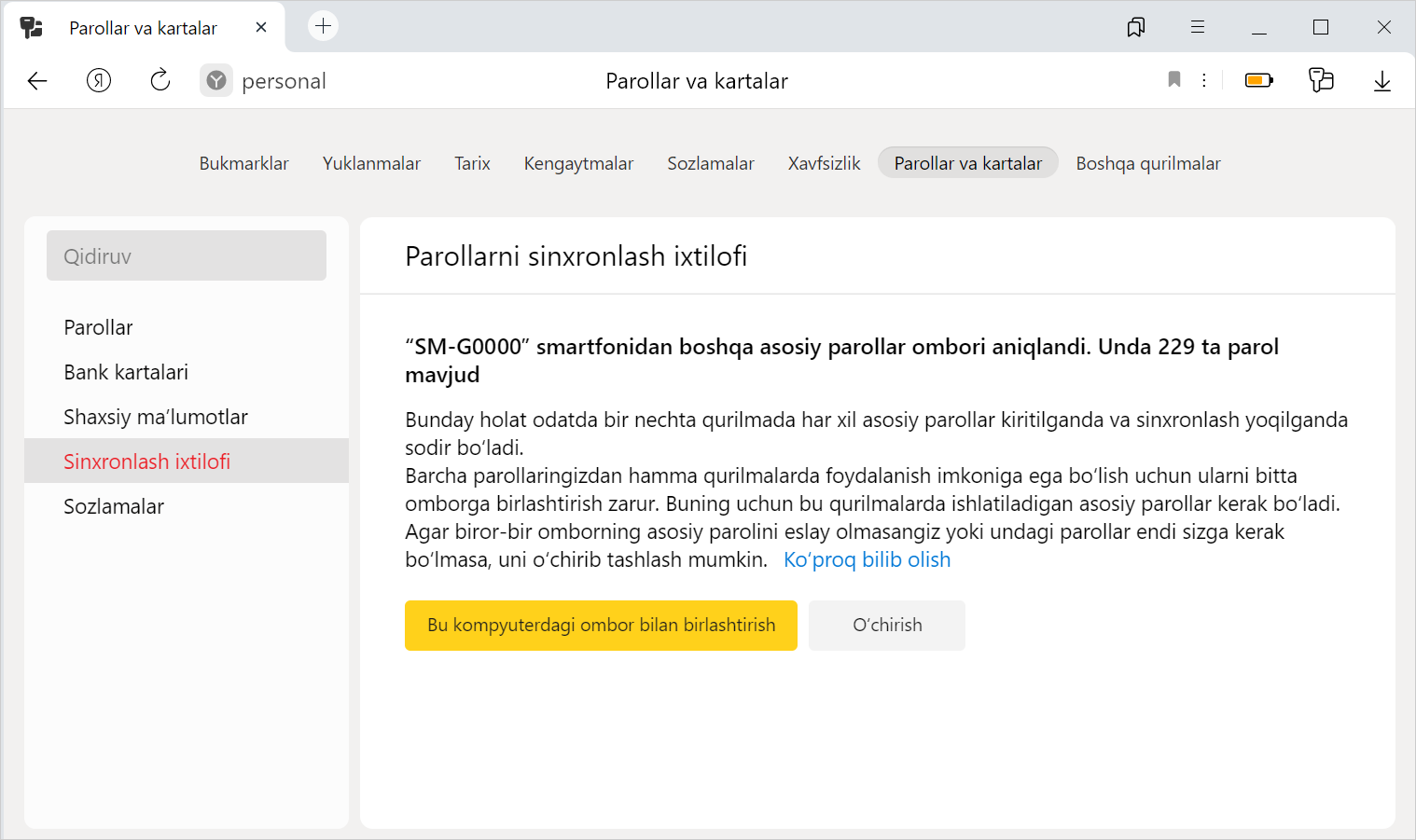 Boshqa qurilmadagi Yandex Brauzerda saqlagan parollaringizni kompyuterga o‘tkazish mumkin (kompyuter, smartfon yoki planshet).