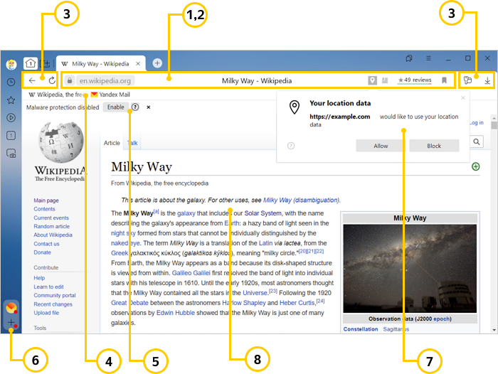 The side panel provides easy access to Yandex services, notifications, tabs, and bookmarks. You can also use it to take notes and control audio playback.