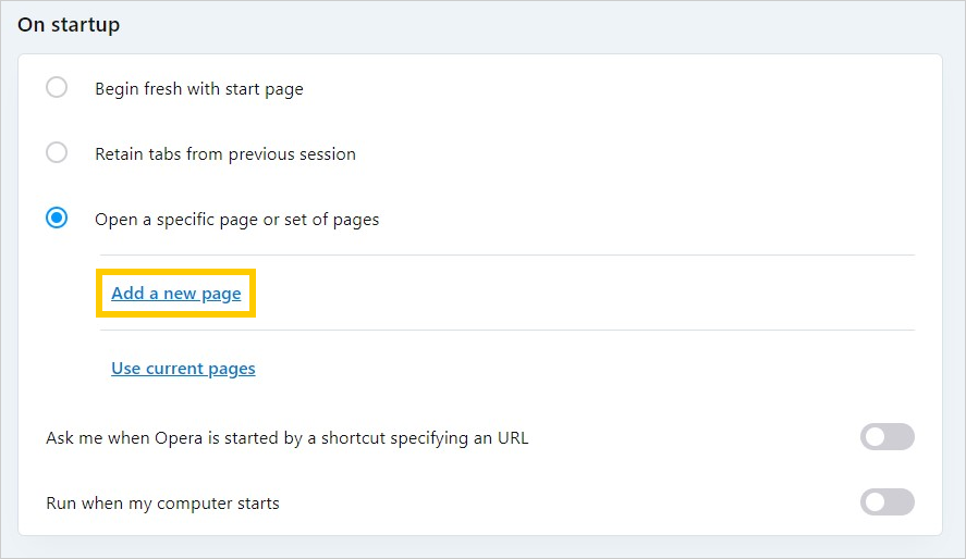 Configure the start page in Opera