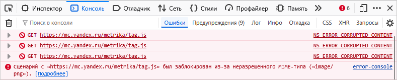 Перейдите на вкладку Консоль и включите фильтр Ошибки. В узком окне название фильтра может быть скрыто: разверните окно.