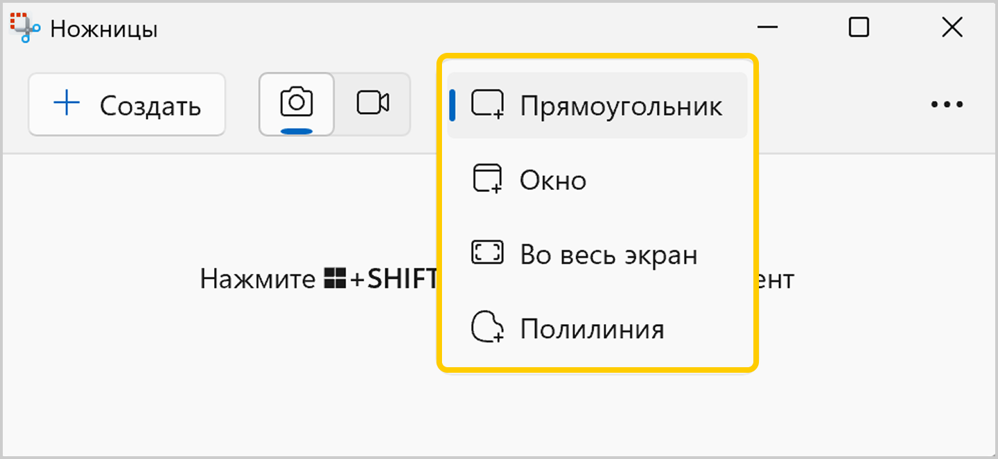2. Нажмите кнопку Создать и выберите область: прямоугольную или произвольную форму, сделайте снимок отдельного окна или всего экрана.