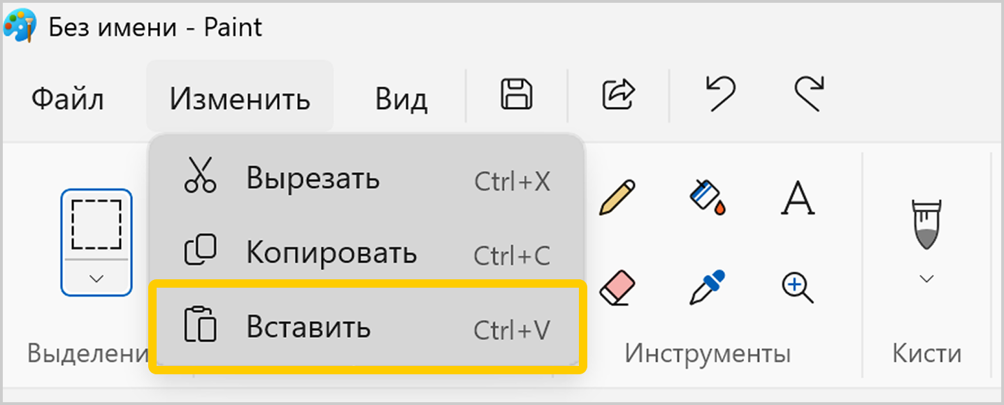 2. Нажмите сочетание клавиш Ctrl + V или в верхнем меню программы нажмите Изменить → Вставить (для Windows 7 и выше).