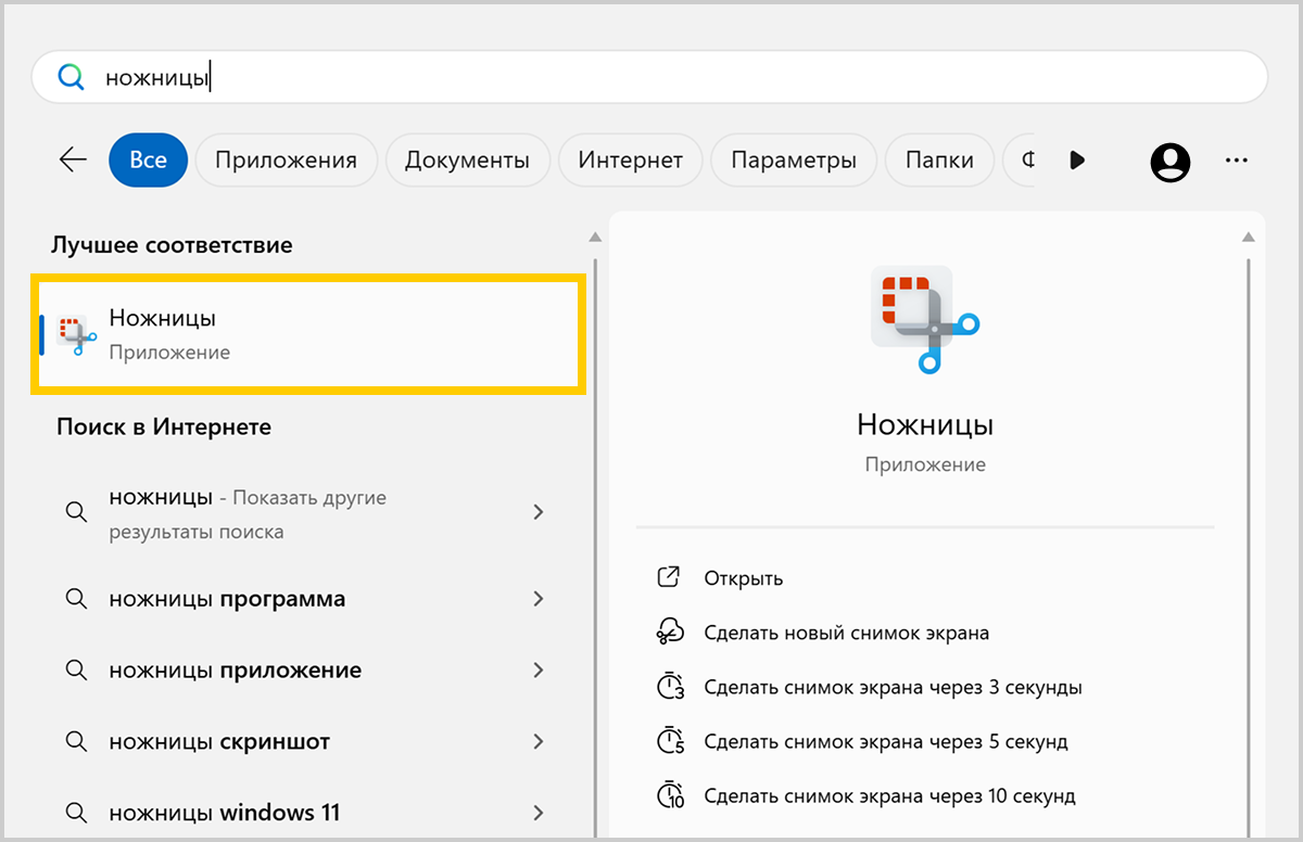 1. Наберите слово ножницы в поисковой строке и нажмите на название программы.
