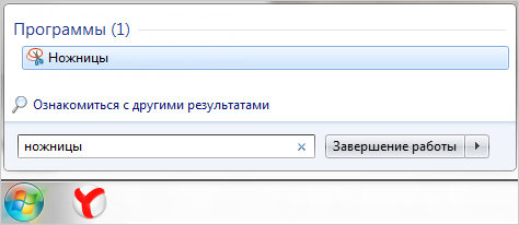 1. Найдите программу в меню Пуск → Все программы → Стандартные или наберите слово ножницы в поисковой строке и нажмите на название программы.