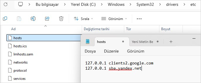C:\Windows\System32\drivers\etc klasöründe bulunan hosts sistem dosyası, site alan adları ile bunlara karşılık gelen IP adresleri listesini içerir.