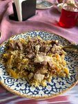 Все познается в сравнении ,как говориться .. Первое -цены . Много выше средних ,туристы туристами ,но это сверх . 96.000 за порцию это вообще не норм . Отдаю голос в копилку Besh kozon. 2. Порция и подача . Мы заказывали «Свадебный» ,нам принесли пустой классический плов ,вкусный ! ,слов нет ,но зачем оформлять в названии меню ,где на фото есть казы ,перепелиные яйца .. а приносить пустой и оправдываться ,что так надо . Еще один плюс Беш казану. На фото показала размер порции для понимания. 3. Место не привлекательное ,внутри жутко темно ,даже не приятно . Общий облик недостроенный ,считаю запустились рано . Облицовка соседнего здания ,стоящего задней стороной просто позорный шлакоблок … Вообщем это было первое и на 95% последнее посещение,сори
