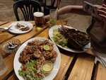 Унылый вид, грязновато, какой-то ручей в море течёт рядом со столами по которому мусор вытекает, то ли канализация, то ли не пойми что. Рыбу пожарили так, буд-то она варёная, креветки средненько, соус так себе, салат из авакадо похож на помои, на вкус пойдёт.