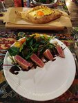 Уже вид с улицы на здание тянет его посетить. Открываешь дверь в ресторан и попадаешь в район старого города Тбилиси. Гостеприимство чувствуется как только заходишь! Здесь вас от души накормят и напоят (мои спутники были в восторге от персиковой чачи😁)! Салат с тунцом был просто вкусный, пока не съела гигантские каперсы, очень вкусно!!! А на горячее я заказала Тавадури (фирменная котлета от Шефа с огнём),нежность внутри хрустящей корочки превзошли все ожидания! Так же оценили на "5+++": салат Тбилиси, хачапури по-аджарски, чахохбили и чувство юмора официанта! В ресторане фоном звучат мелодичные песни на грузинском языке. Впечатления самые-самые остались у всей нашей компании!