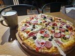 Пицца очень вкусная (брали баварскую, острая, но в меру), латте было очень молочным(как и полагается), капучино паннакота было необычным и вкусным. Тут основное на вынос, но можно съесть и на месте. Кружки для кофе и миски для супа керамические, но приборы пластик. Ждали на время приготовления пиццы, минут 15-20, но время за просмотром и обсуждением увиденного за день пролетело быстро. Были в будний день около 20-21. Спасибо большое за гостеприимство. Были проездом.