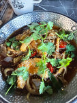 Интересный интерьер. Заказала крыло ската, оно удалось. Такое оно и должно быть. Кто не знаком с блюдом, будет удивлен большим количеством хрящей. Попробуйте! Как минимум это оригинально
