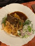 Как нам сказал гид , ожидания туристов сильно завышенны на Пяткин , прям в точку. Сколько слышала про этот ресторан и выбирая русскую кухню в Новгороде выбрали именно его. Уютно да , цены приемлемые , но кухня прям средне. Оливье все же не оливье, грузди плохо промыты, песок хрустит на зубах, рубец с запахом , хотя сейчас можно спокойно готовить и без, сама дома часто готовлю и много где кушали , ну сельдь подавать в русском ресторане сухую и очень не вкусную это совсем не правильно . Котлеты щучьи взбитые как суфле , все же они должны быть с нормальным прокрученным фаршем , котлета мясная была пережарена , сухарики с одной стороны подгорели . Но удивило очень вкусное пиво нижегородское разливное . Жалеем что выбрали данное место .