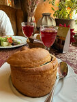 В целом, ресторан топового уровня. Тут и аутентичная атмосфера, и традиционная кухня и всё прочее, что должно быть, тоже на месте. Но я на своём опыте столкнулся с неприятными нюансами. Мне показалось, что наша компания с порога что-то должна официантам. Мы, наверное, недостаточно быстро выбирали по меню, просили помочь, уточняли что-то.. Наша официант была очень недовольна. Это, конечно, сложно подтвердить, но это показалось всем одновременно. Не знаю, насколько приветливы остальные, но у нас случился полный дисконнект. В рестике полная посадка. Нужно не только забронировать столик, но и сделать заказ не позднее чем за час до закрытия - потом кухня не работает. Объяснимо, конечно, но это в интересах заведения, как мне кажется - продлить время работы летом/в выходные, продлить время работы кухни до закрытия. Далее. У нас отсутствовали многие позиции в меню. Но если блюдо, другое могли раскупить, то почему самовар на компанию не дали - загадка. Дефицит бубликов/воды/варенья? Теперь к плюсам - блюда вкусные, тут всё просто отлично. Настойки могли быть лучше, но тоже неплохо. Интерьер крутейший, расположение просто козырное. Однозначно стоит сходить. И сам тоже ещё приду, хотя бы для того, чтоб дать второй шанс по обслуживанию.