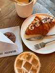 Довольно популярное место. В отзывах часто упоминают круассаны, хвалят их. Что ж, я решила попробовать. Конкретно этот круассан с ветчиной стоит 390 рублей. Честно говоря, не ожидала увидеть такой разворот круассана. Цена явно завышена за полупрозрачный кусочек ветчины, кусок сыра, 2 кружка помидора, каплю соуса (майонеза) и уставший лист салата. Также пробовала круассан с молочным шоколадом. В целом, сочетание вкусное, сам крем отличный, не приторный, похож на нутеллу. Сами круассаны не хрустящие, совсем. Хотя стоит отметить приветливый персонал, девочки лучезарные, приятные.