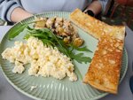 яйца, соус томатный, тимь-ян масло, рейган, кинза, чиабатта