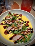Салат с уткой, малиновым кремом и попкорном из гречки