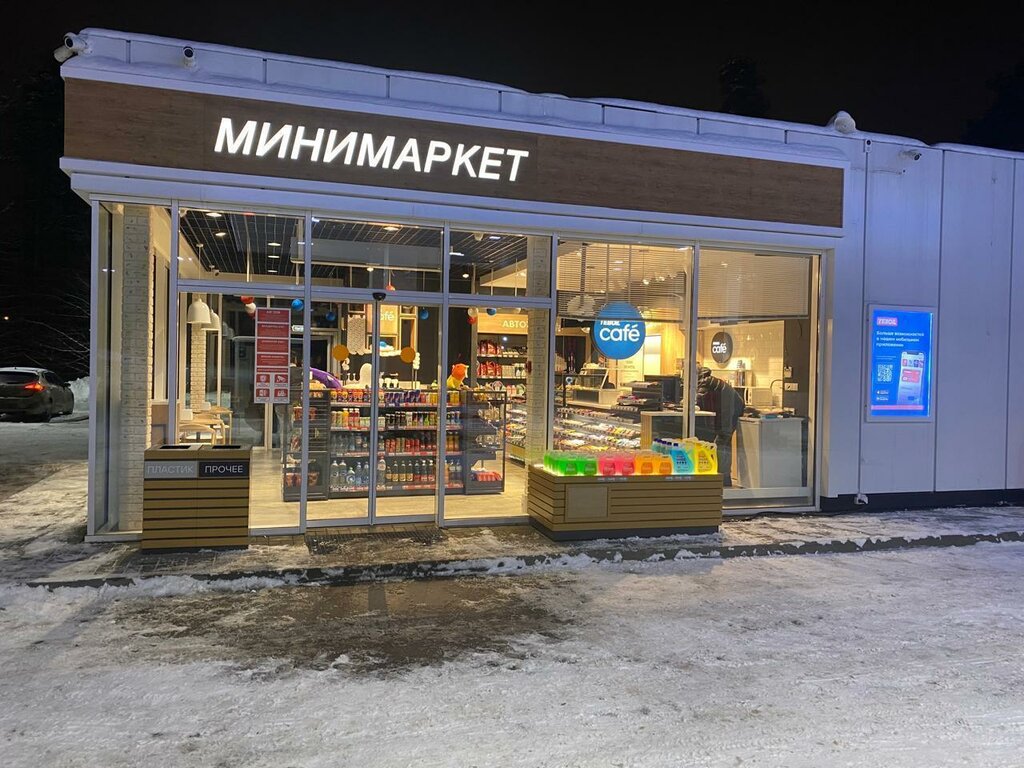 Открыли, хорошо. Бензин среднего качества, машине не нравится. Маленькое помещение - но есть, что выбрать. Уборная чистая. Сотрудник как робот, в двух сменах одинаково, заученные фразы, никаких эмоций. Кофемолка и кофемашина не настроены, кофе не вкусный!