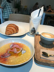 Есть плюсы, но минусов больше к сожалению. Из плюсов - вкусный кофе, сырники, салат с креветками, ну и еще пару блюд. На этом все. Персонал вечно недовольный, такое ощущение что их держат в рабстве, отняли паспорта и им приходится там работать. Выпечка невкусная чаще всего, последний раз показалась не свежей, возможно дело в этом. Круассан с креветками дико острый( об этом не предупредили, и в меню не указано) Утром стоит гул как в школьной столовой) Вывод - что на вынос взять кофе и определенные блюда - да, возможно, но если нет других вариантов совсем)