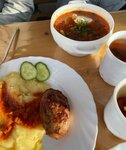 Остановились в этом кафе, так как в нашу Казачку нужно было разворачиваться, а это место было по пути, плюс высокий рейтинг . На удивление остались довольны!!! Спасибо девочкам кухни, все блюда были вкусными и по домашнему( борщ, котлеты и особенно сковородочки с картошкой и свининой!₽ Борщ и котлеты с пюре подали быстрее, а жареную картошку в сковородках ждали 20 минут и не зря !!! Дома такая не всегда получается! Женщина на кассе помогла с выбором, спасибо!