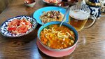 Вкусно! Заказывала манты, салат, люля кебаб. Плов - мощная порция) удобное место, национальный колорит. Но тесный туалет, громкая музыка...