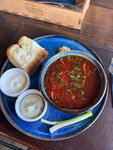 Вид в ясную погоду шикарный! Глинтвейны- согревающие, вкусные. Если в меню есть борщ, то с вероятностью 99% я закажу его и тут также было) Довольно вкусный, но не лучший; больше мне понравились дополнения к нему: очень свежая пампушка, лучок, горчица и сало, в зимнее время года согреешься) муж заказывал бургер с ягненком- сочный, хороший. Обслуживание, официант- понравились. Цены выше среднего.