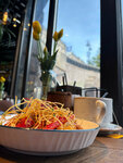 Этот уютный гастробар сразу располагает к себе своей светлой и теплой атмосферой. Интерьер выполнен в современном стиле с использованием натурального дерева, а яркий букет желтых тюльпанов на столе добавляет весенней свежести и радости. Главным героем стола стал аппетитный салат с хрустящими баклажанами. Свежие продукты, вкусная заправка. Сверху блюдо украшено нежным мягким сыром и микрозеленью, что делает подачу изысканной. Для согрева был выбран ароматный облепиховый в прозрачном чайнике, который идеально дополняет трапезу. Внимание к мелочам, таким как аккуратные деревянные подставки для приборов и льняная дорожка на столе, создает ощущение домашнего комфорта. Прекрасное место для неспешного ланча или уютного вечера. Свежие ингредиенты, эстетичная подача и солнечные цветы делают визит сюда по-настоящему приятным. Маленькая Голладндия в центре Санкт-Петербурга! 😉Рекомендасьйон 100% P. S. Гастробар dog-friendly 🐕приводите своих мохнатых друзей