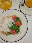 Матча с карамелью это теперь мой любимый напиток, не сильно сладкая, как я и хотела. Завтрак с баклажанами и завтрак с лососем огонь. Баланс всего вкуса. Особенно хочу отметить оладьи из кабачка. Объедение!! Вафли обалденные, брала с ветчиной и бананом. Обе восхитительные. Кофе хороший. Рикотникам на мой вкус не хватило сладости в топпинге или ягодах или том на чем настаивали чиа, мне было кисло (не испорчено, а просто не сладко), доьавила мороженого из вафли с бананом и стало хорошо. Спасибо за вкусный завтрак и хорошее утро. Да, может и хочется побыстрее, но когда ты заказываешь столько многосложных блюд, то как-то 20 мин до подачи первого воспринимаются нормально) так что не переживайте и не меняйте качество 🙏🏻