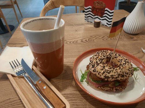 Давно хотела посетить данное кафе, но никогда не было времени. Вчера раздавали флаеры, за предъявления которых можно было получить бесплатный напиток, и я решила не тянуть. Зашла в кофейню часа в четыре, но народу было две девушки и я. В зале играла приятная музыка и мягкий свет. Было чисто, единственное, что мне показалось неудобным, то, что диваны у стены были слишком далеко от столов, и поесть, облокотившись о спинку дивана, не получится. Я попросила бармена подсказать, что можно взять. У них есть сладкие и сытные. На классической, цельнозерновой и безглютеновой булочке, за это ставлю плюс. Кроме бубликов у них есть боулы и завтраки. Также есть вариант собрать бэйгл самостоятельно. Барная карта состояла из кофе: альтернативного, ледяного, их фирменного и экспериментального, чая: противного и классического, какао и матча. Цены, наверное, чуть выше среднего. Я взяла бэйгл «Германи» и айс-латте на кокосовом. Бэйгл был вкусный, сытный, но немного острый. Айс-латте нормальный, но я пробовала лучше. Туалет тоже был чистый, но был небольшой запах. Мне очень понравилось данное заведение, зайду еще.