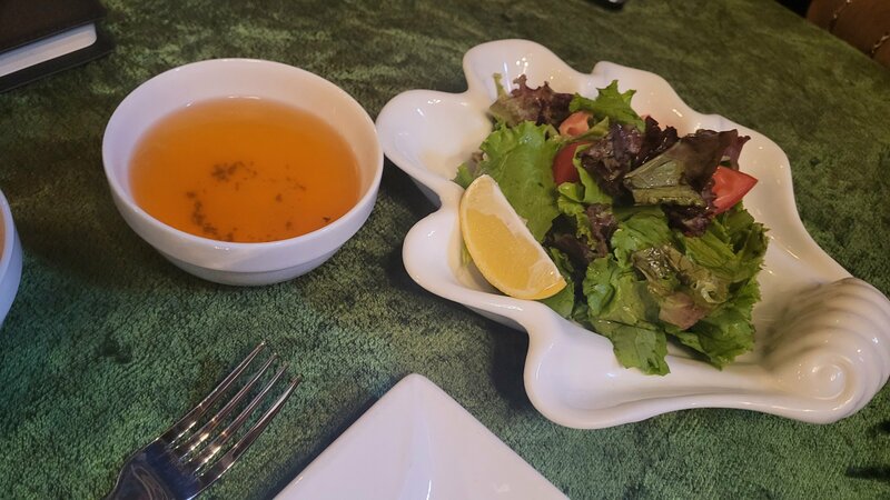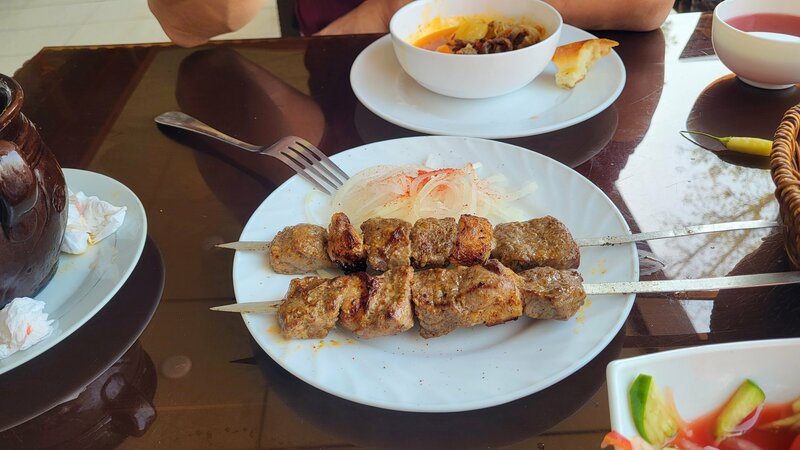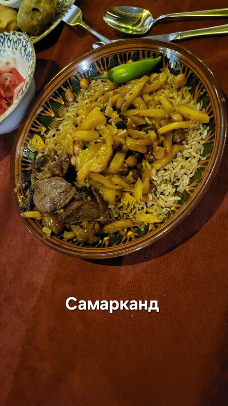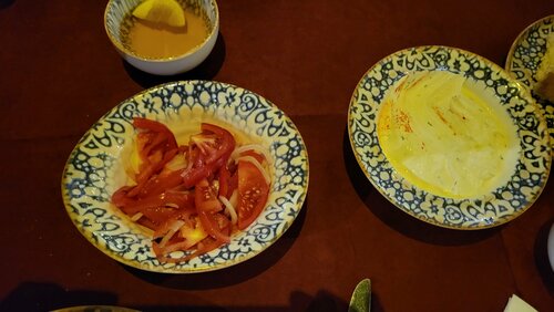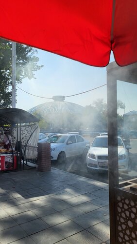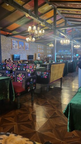 В прекрасный осенний день перед проводом гостей прогулялись по набережной Анхор и зашли пообедать в кафе Камолон Ош. Расположен очень удачно,на мой взгляд, есть парковка,но не всегда найдётся место,так как посетителей очень много. В зале нас встретила девушка в национальной одежде и проводила за стол,выбрали мы его на террасе,где непонятно откуда пели птички) Официант, также в национальной одежде, быстро,но невнимательно принял заказ и больше мы его не видели, блюда и счет принесли другие ребята. Еда вкусная, мастава чуть пересолена, но шурпа просто отличная. Мне понравилась тема со свежевыжитыми соками,которые подают в пластиковых бутылочках. Сейчас сезон граната и не только, приятно выпить перед едой витамины) Здесь есть несколько видов плова и люди в основном ради плова приезжают сюда,а у нас сегодня было непловное настроение) Если вас не смущает большое количество людей вокруг вас,а вы хотите вкусно и сытно поесть,то рекомендую это место.