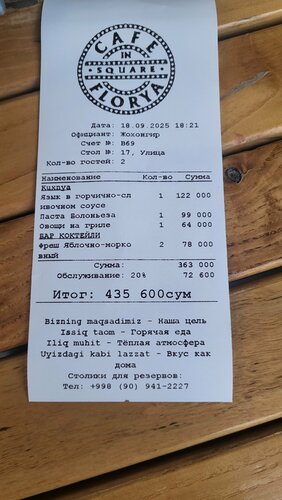 Во время прогулки решили заглянуть на ужин в кафе Флория, расположенного в очень привлекательной локации возле театра Навои.Наверное, многие проходили здесь, где стоят столики вдоль тротуара, сидят гости и мимо бегут прохожие) Атмосфера милая, осенняя. Есть своя прелесть в этом кафе у дороги. Кафе работает круглосуточно, есть завтраки до 11 часов, имеются кальяны,алкоголя не обнаружено. Официант быстро принял заказ и на этом мы его потеряли. Подходили другие ребята,но нашего не дозвались даже когда нужен был счёт. По еде: язык был свежим, но фантазию повара о сочетании языка и кукурузы не одобрила)) Паста также не была хорошей. Вместо свежих солнечных помидор бахнули томата, что,конечно же,испортило вкус(( Не знаю,как в этом кафе вечером и ночью,но за недешевыми и невкусными блюдами и пропавшим официантом с 20% обслугой я больше не пойду))