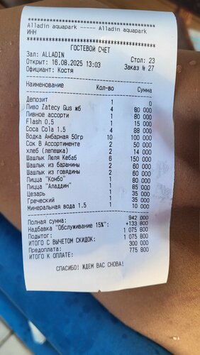 Для завершения купального сезона отправились в Янгиюль, аквапарк Алладин. В прошлом году были только положительные эмоции от посещения бассейна. В этот раз надежды не оправдались. Хотя дни жаркие, сотрудники бассейна сбавили обороты по работе,обслуживанию и вообще сервису. Горки практически не работали, только в один сектор можно было зайти. Бармен и по совместительству диджей ставил жуткую музыку, а временами отключал вовсе.,несмотря на неоднакратные просьбы. А между прочим,была суббота,должен был быть нормальный диджей и всякая анимация. С едой естественно, тоже были проблемы. Шашлыка почти никакого не было,готовили и несли его больше часа. Только за воду и сам бассейн все звезды. Ну и одна официанту Косте,который старался,как мог. Динозавр постарел и требует реновации)) Да и вообще,лежаки и беседки устали, про раздевалку промолчу. Администрации предлагаю провести полный ремонт всего вокруг.