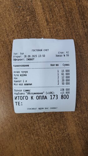 Наступила пятница и мы выбрали себе место для сегодняшнего ужина в семейном кругу. Сегодня это непривычная для нас локация Чиланзар и ресторан Аср. Мы раньше бывали в этом ресторанчике на круге Аль-Хорезмий, всегда была повышенная посещаемость, даже бывало,что нет свободных столов. В эту пятницу людей практически не было. Нас очень тепло встретили, предложили пройти в зал, но мы выбрали этот приятный осенний вечер провести на летней площадке. Нам принесли пледы и заботливо накинули на плечи. Официант Азиз встречал и обслуживал нас, как будто мы пришли к нему домой, настолько тепло и трепетно. Еда и закуски были отличными,единственное замечание салатчице-несвежий сыр в салате. Мясное блюдо мы выбрали по рекомендации Азиза и не пожалели. Отлично приготовленное мясо и красивая подача создали прекрасное настроение нам в этот вечер. Позже мы даже перешли в зал и потанцевали,что не входило в наши планы) Итог: рекомендую это заведение: цены приемлемые, блюда роскошные,порции большие. Азизу отдельная звезда.