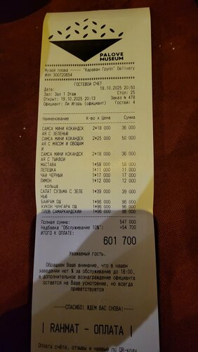 В прекрасное осеннее воскресенье приехали гости из Москвы и мы пришли ужинать в ресторан Музей плова. У этого ресторана очень мощная реклама везде и всюду, масса горячих (в отличие от их блюд) отзывов,которые не соответствуют истине. Но попробую изложить) Локация неудобная, кольцевая автодорога, вокруг стройка, нет парковки. Вход симпатичный, настраивает на нечто волшебное,восточное) Расположение внутри очень интересно, идёшь и видишь внизу,за стеклом кухню и поваров. Хостес проводила нас в зал, уведомив, что на улице все занято, но и не хотелось там сидеть, было прохладно. В зале царил полный хаос. Официанты уныло бродили мимо неубранных столов,стулья стояли там и тут.... Прям ресто-обстановка и все это под национальную музыку ансамбля) Мы растерянно стали располагаться за столом. Кресла не подходят для столов,слишком низкие. Сообщила это официанту-закатил глаза,но поменять на стулья помог. Ждали меню, официанты кучковались возле входа в подсобное помещение, но к нам не торопились. Когда подошёл официант, мы узнали,что плова Андижанского, Бухарского нет. Есть Самаркандский,Тошкентский и Кокандский. На мои возмущения,что я звонила предварительно и меня уверили,что как раз открывают казан с Андижанским пловом, развели руками. Принесли ачичук и сузьму, по фото можно заметить подачу, вот совсем не ресто... Плов был слегка тёплым, от этого все казалось очень жирным. Никто не поел свой плов. Итог: В ресторане,каким он себя заявляет, должен быть комплимент гостям, для придания калорита. В видеообзорах все это присутствует, в реале-нет. Буду ли рекомендовать этот ресторан? Разумеется, нет. Спасибо,Караван гроуп!