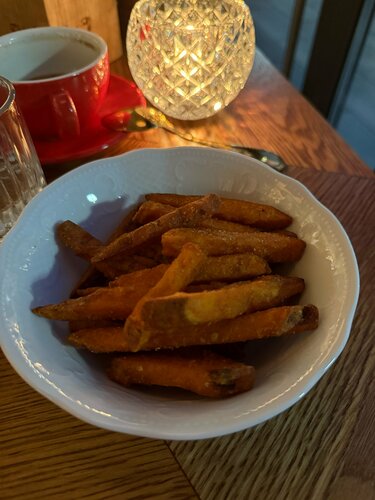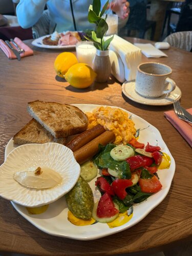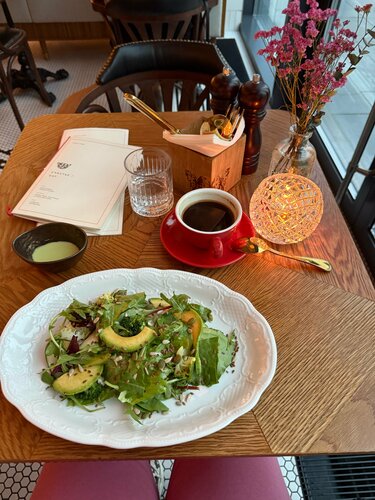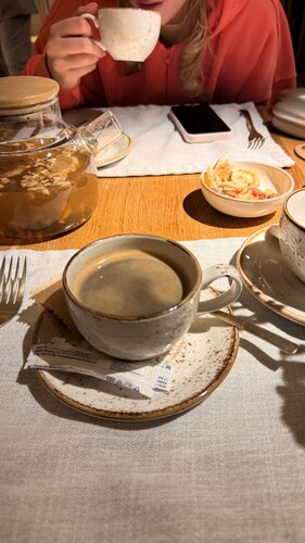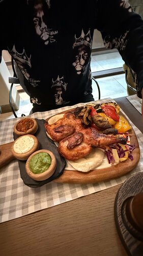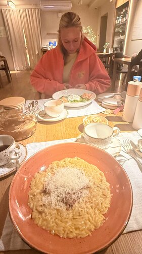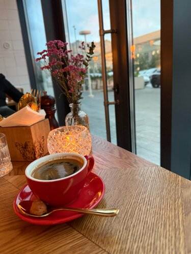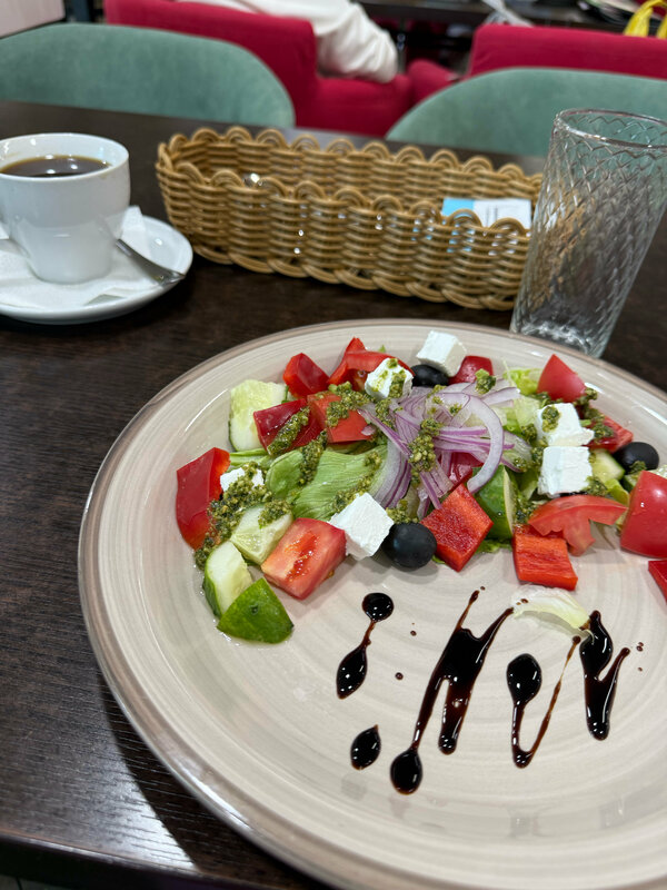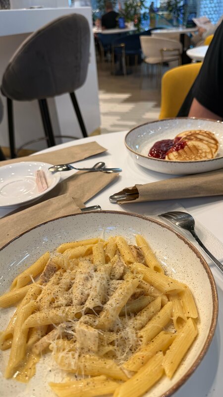 Обедали сегодня здесь. Не понравилось. Паста долго стояла готовая и в итоге ее принесли холодную. Муж брал мясо с пюре. Принесли с брусничным соусом, хотя в описании блюда в меню это не указано. Ему не нравится брусничный соус. Если бы было это указано данное блюдо мы бы не брали. Так же я ела греческий салат в котором помимо всего что должно быть был кабачок, очень странное решение.. из плюсов был вкусный кофе и блинчики с джемом.
