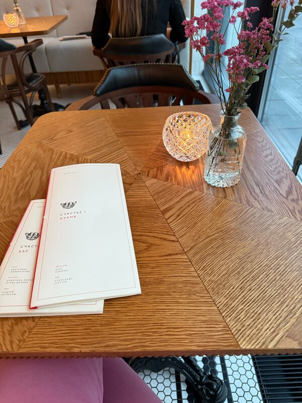 В счастье я была первый раз. Свой поход я оцениваю на 4-. Но обо всем по порядку.. Столик я забронировала заранее,на входе меня встретили приветливо проводили к столику и сразу дали меню. После этого официант подошел ко мне через 10 минут только. Для меня это очень долго. Иногда я уже заранее знаю что хочу заказать и сидеть ждать 10 минут чтобы сделать заказ это много. Официанты приветливые но приняв заказ, на тебя внимание не обращают. С трудом сделала до заказ еще одного блюда. Есть питерская, но до питерского сервиса еще расти и расти. Мне есть с чем сравнить. Мой выбор пал на зеленый салат , томатный суп и батат фри. Батат фри конечно самый вкусный в городе из тех что пробовала. Остальные блюда по вкусу на 4. Также я пила кофе который мне понравился. В целом прийти поесть можно, но сервис нужно дорабатывать.
