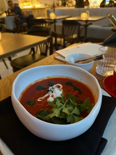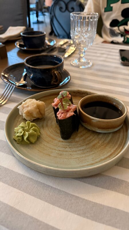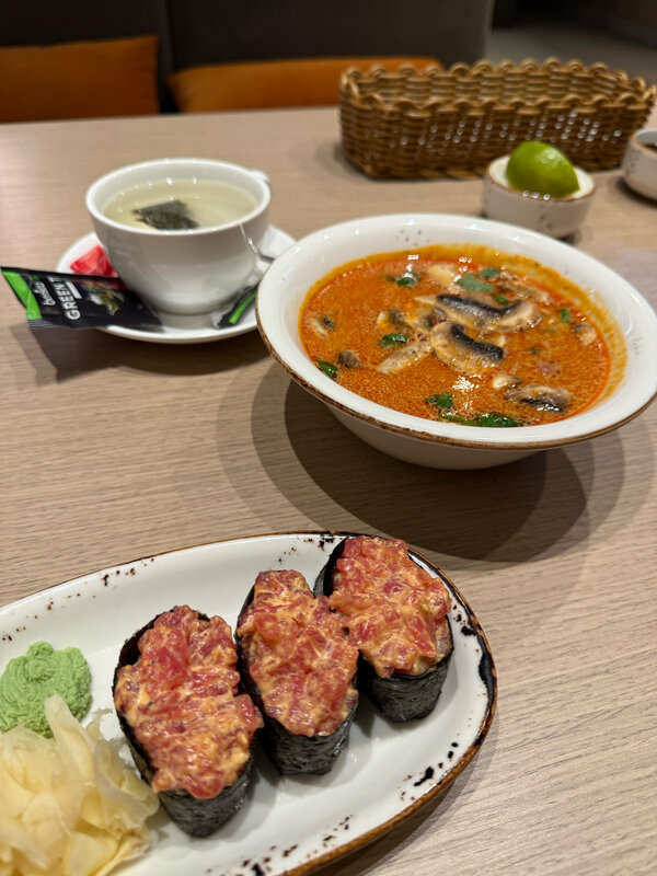 Иногда заезжаю сюда после работы на ужин, особенно когда холодает и хочется поесть горячий суп. Что мне здесь нравится то что вечером народу не много и можно спокойно присесть и тебя быстро и приятно обслужат. Мой стандартный набор это суп тайский с курицей , обязательно к нему отдельно прошу дольку лайма. И 3 острые суши с тунцом .