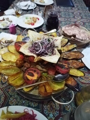 Я и одну звезду не стала бы ставить! Были 10 сентября, 2024 г. пришли в четвером ,днём, людей не было, сели в беседке на улице, изначально удивило то что диваны пыльные, никто не протер, и не предложил! Скатерть вся прожжённая, но это меньшая из бед! Официант Артур ( если не ошибаюсь) на столько не профессионален, на сколько это возможно, не разу не улыбнулся, на вопросы отвечал не охотно, ощущение что если он что-то скажет, его побьют ! Еда не вкусная, сэт шашлыка принесли еле теплый, салат который заказала я , безвкусный, у мужа был Цезарь, листь в нем похожи были на что то странное, как будто их вытащили из другого блюда( не удивлюсь если так и было), лепешки принесли холодные, селедка с картошкой это отдельное искусство, принесли ледяной картофель, и пресерву из магазина! Садж кеба был еле теплый, спросила можно ли поджечь угли, а они не горели, официант сказал нет! Ели холодное мясо и холодные овощи, хотя выглядело блюдо не плохо, Я в шоке, отдать такие деньги и за что? Я такое видела первый раз! Вкусным был только компот! Нас предупредили что расплатится нужно будет в 23:00, а в 23:30 покинуть помещение, мы согласились! Но! Как только мы расплатились, официант начал уносить тарелки, с едой, пришлось отбирать, а он заявил что они закрываются, аргументируя это тем что уборщица не будет ждать до 24:00! Когда мы начали проявлять недовольство, официант спрятался в внутри кафе, с администратором, которая не попыталась даже решить конфликт. Мы как и договаривались, ушли в 23; 30. Больше в это заведение ни ногой! День был испорчен не вкусной едой, холодной, и некачественной! Мы были единственными посетителями в этом заведении, и вот такое отношение к гостям! Отдельное спасибо девушке которая сфотографировалась со мной в национальном костюме, очень приветливая, приятная! За свой алкоголь мы заплатили 10 процентов от общего чека, он был не маленький. А если бы в заведении был алкоголь который заявляет меню, то своё не покупали бы,! А еду съели не потому что вкусно, а потому что за неё заплатили, и нужно было чем-то закусывать! И нас было 6 человек, а не 7, и то двое пришли в середине вечера. А такое отношение к гостям, это позор руководства!