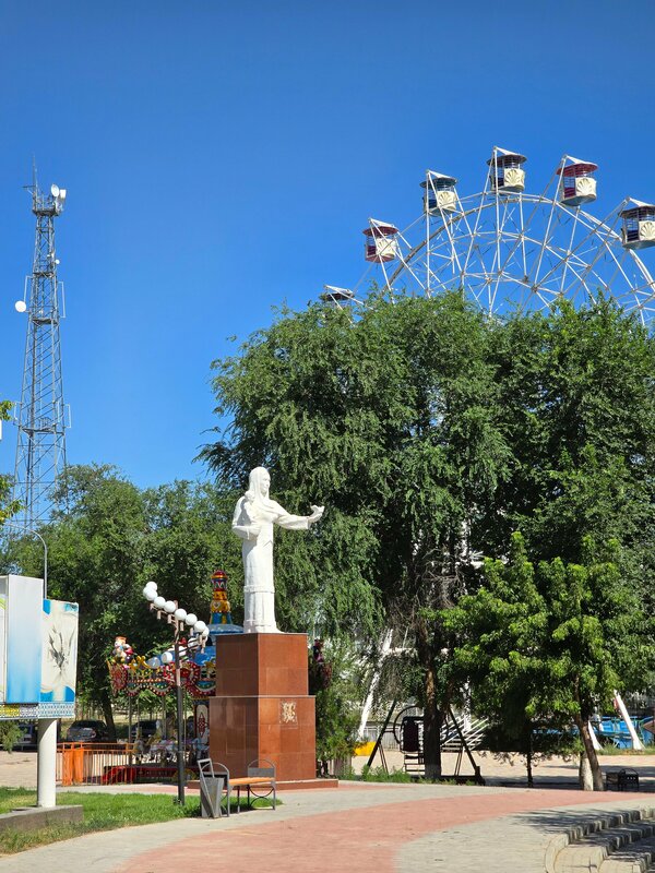 В Туркестане очень мало высоких, ветвистых деревьев , можно сказать что все высокие деревья растут лишь здесь. В центре старого города , старинный парк , старые аттракционы. У парка собственный антураж , шарм , как будто после целого дня в шумном , жарком Туркестане , на некоторое время оказался в другом городе. Там тишина и тень , Есть удобнын парковки , нехватает фонтанчика какого-нибудь.