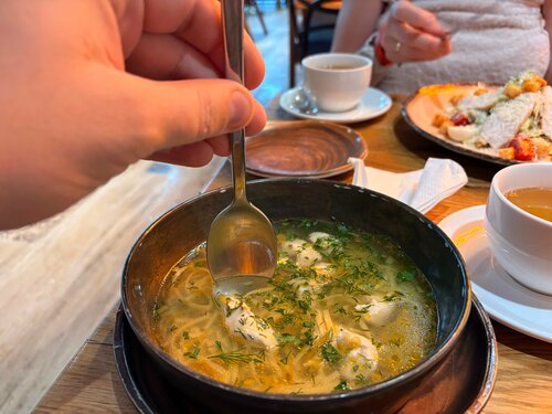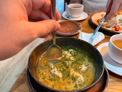 В 15-00 в будний день делать тут нечего. Парение начинается с 17-00 !!! Что тут делать до 16-30 ??? Кушать и платить за время? Баня холодная даже в 16-00 была и она холодная в принципе. т.е. если вы между парениями придете, то там будет холодно. У конкурентов в центре между парением уши сворачиваются. Еда - отдельная история. Принесли суп-лапшу (на фото смотрите), ощущение что ее по дороге официант подъел. По вкусу это просто вода с вермишелью, а стоит как целая курица.